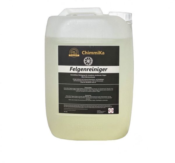 Eigenschaften:                                                                                                                                                                              ChimmiKa Felgenreiniger zeichnet sich durch seine kontaktlose Reinigung aus. Unser Felgenreiniger reinigt Ihre Felgen ohne den Einsatz von Bürsten bzw. Schwämmen. Dank hochqualitativer Inhaltsstoffe bietet er die maximale Reinigungskraft. Der kraftvolle Reinigungsschaum dringt tief in die Verschmutzungen ein und löst diese bereits beim Aufsprühen sichtbar auf. Gleichzeitig greift er die Oberfläche nicht an und entfernt schonend hartnäckige Verschmutzungen wie Bremsstaub und Ruß. Das Ergebnis nach der Anwendung von ChimmiKa Felgenreiniger sind kratzfreie und optimal gereinigte Felgen.              Geeignet für Aluminium- und Stahlfelgen.